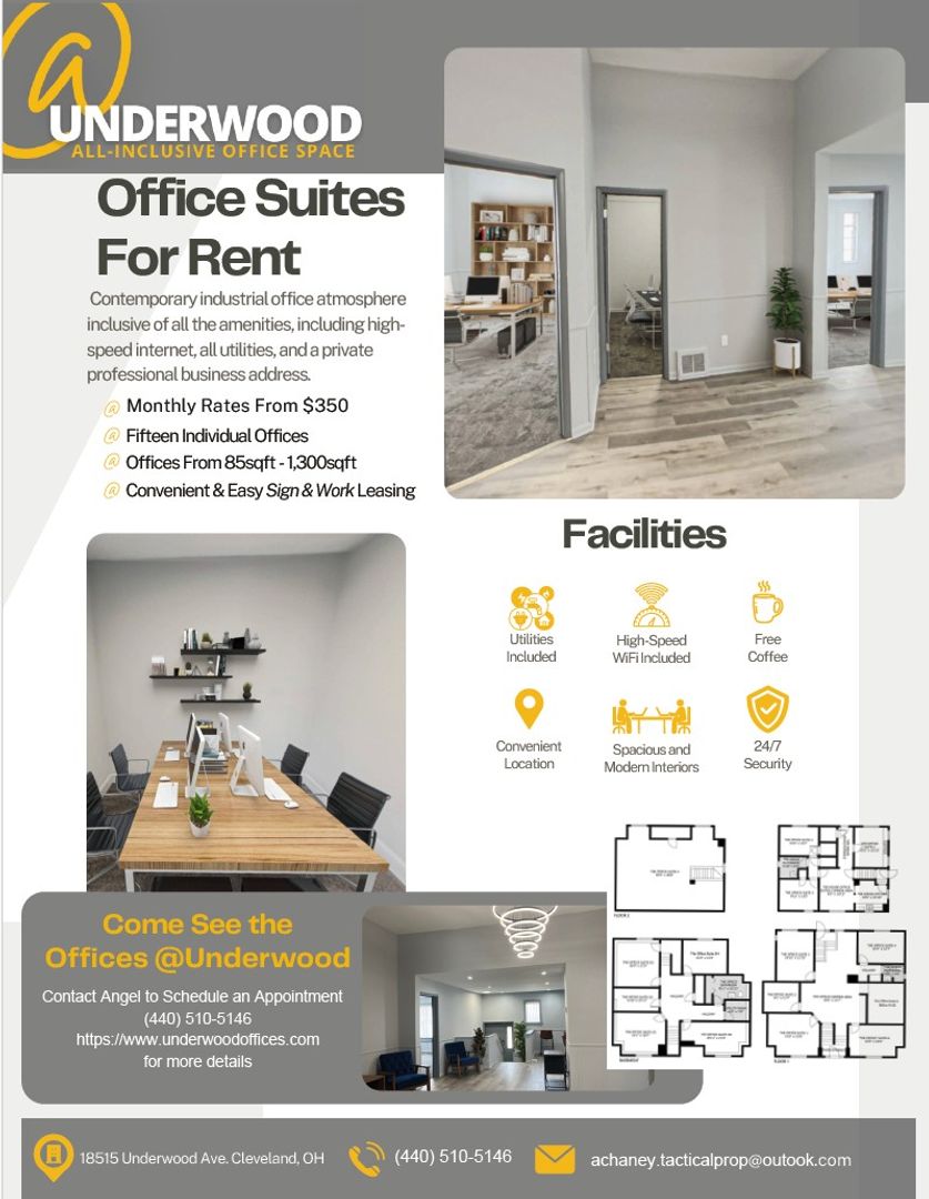 Welcome to Offices@Underwood! Discover a modern and professional workspace in the heart of Cleveland at the Offices@Underwood. This beautifully updated office suite offers a fresh and inviting atmosphere with newly painted interiors and brand-new carpeting that add warmth and elegance to the space.